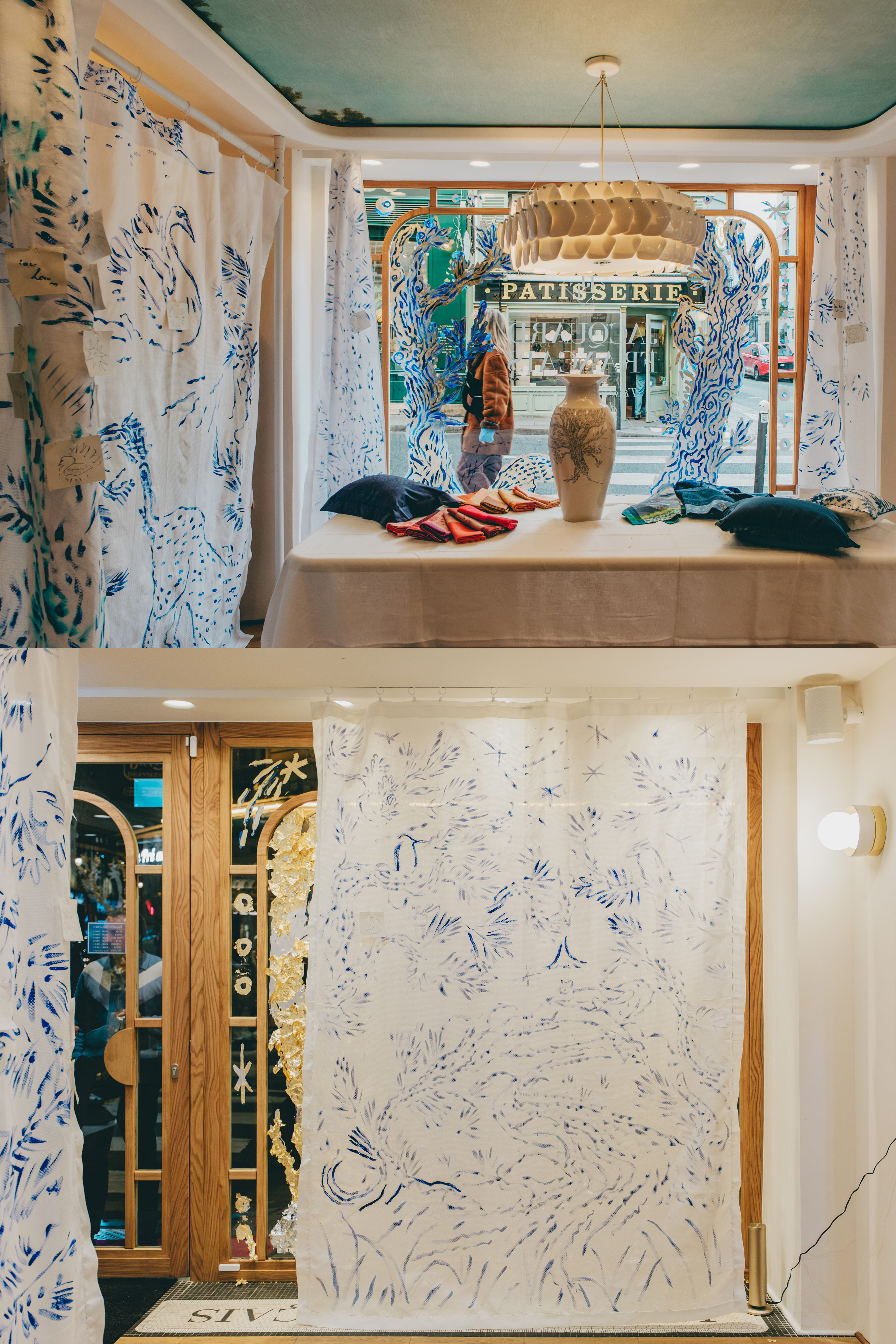 Desplegada sobre grandes cortinas y una ropa de cama concebida como un paisaje, la instalación deja entrever una fauna discreta y poética que parece surgir suavemente de un decorado nevado. Los escaparates prolongan esta atmósfera onírica gracias a sutiles juegos de luz, invitando a los transeúntes a ralentizar el paso y adentrarse en este universo acogedor.