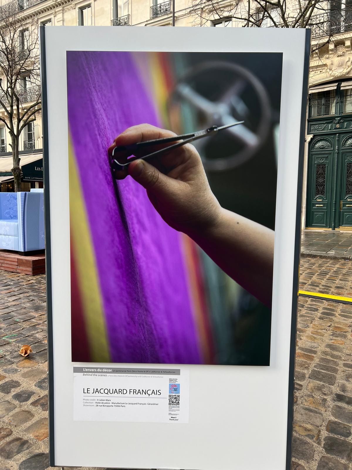 En sintonía con el tema El reverso del decorado, Le Jacquard Français presentó asimismo una obra fotográfica expuesta en la Place Saint-Germain-des-Prés, en el marco de una colaboración con LabKorner y YellowKorner. Realizada en el corazón de nuestra manufactura de Gérardmer, esta fotografía capta un momento clave de nuestro saber hacer: la inspección del tejido, una etapa decisiva en la que cada pieza es examinada minuciosamente, por el derecho y el revés. Un instante suspendido, en el que la mano experta garantiza la exigencia, la belleza y la durabilidad de nuestras creaciones. A través de estas dos instalaciones, Le Jacquard Français rinde homenaje a lo que anima a la Maison desde 1888: el respeto por el gesto, la transmisión del saber hacer y el diálogo constante entre materia, creación y emoción.